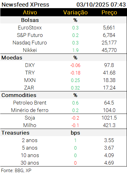 Nos EUA, às 10h45 será divulgada a leitura final do PMI de serviços de setembro (exp. 53,9) e, às 11h, o ISM de serviços do mesmo mês (exp. 51,7). O payroll não será publicado hoje, como inicialmente previsto, devido ao shutdown. Hoje teremos falas de cinco fed speakers ao longo do dia.