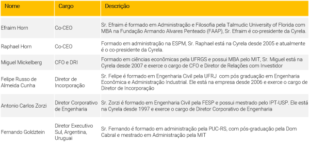 Fundada há mais de 50 anos atrás pelo principal acionista e controlador Elie Horn, a Cyrela é uma das maiores incorporadoras brasileiras, focada principalmente no segmento residencial de médio e alto padrão. No entanto, a Cyrela diversifica seus produtos por meio de suas marcas própria e de parcerias estratégicas (Joint Venture):