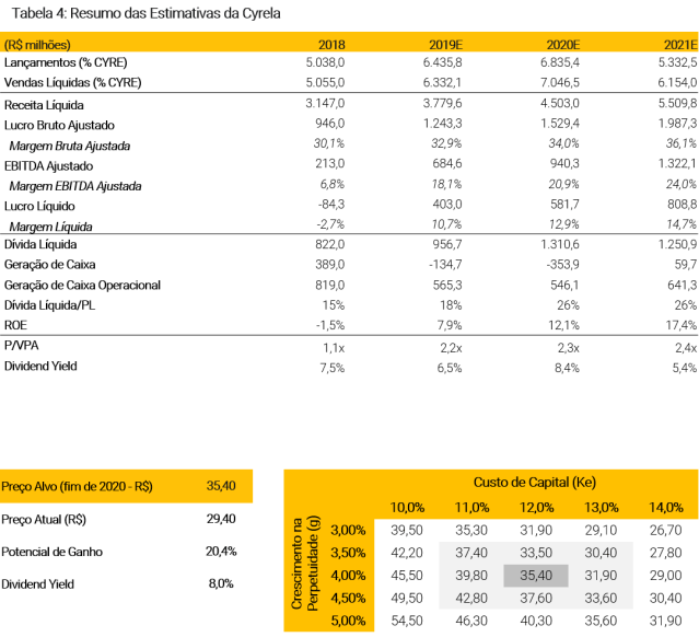 Iniciamos a cobertura de Cyrela com uma recomendação de compra e um preço-alvo e R$35,40/ação, implicando em um ganho potencial de 20% até o fim de 2020. A nossa visão é sustentada principalmente por: