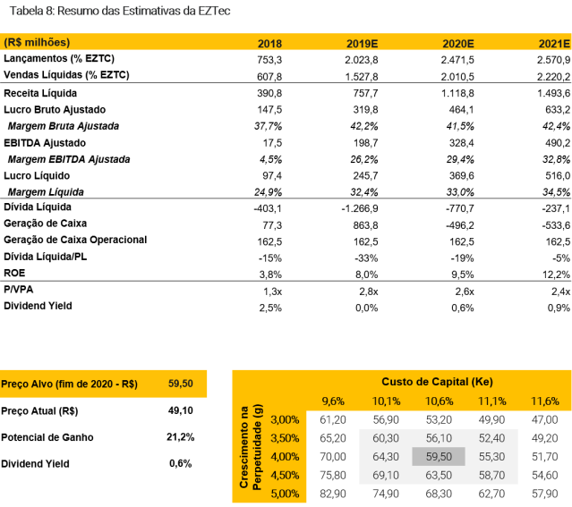 Iniciamos a cobertura de EZTec com uma recomendação de compra e um preço-alvo e R$59,50/ação, implicando em um retorno potencial de 20% até o fim de 2020. A nossa visão positiva é sustentada principalmente por: