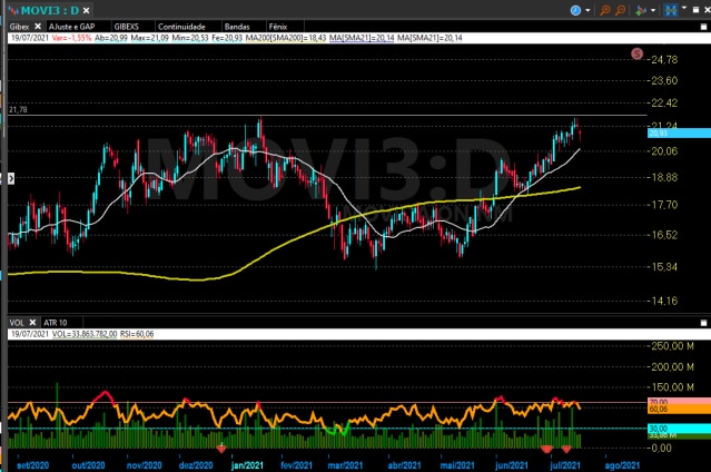 MOVI3 formou candle de baixa em topo duplo sugerindo realização na direção dos suportes em 20,00 ou 18,15. Desfaz o sinal de baixa acima dos 21,67.