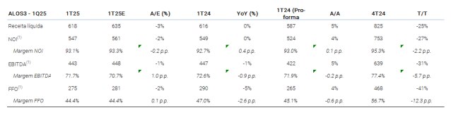 A Allos reportou resultados positivos no 1T25 que, em sua maioria, estavam em linha com nossos números. As vendas dos lojistas aumentaram 5% em relação ao ano anterior e as vendas-mesmas-lojas aumentaram 2,6% em relação ao ano anterior. Entretanto, as diferentes datas de Páscoa entre 2024 e 2025 afetaram esses números. Ainda assim, as vendas no acumulado do ano aumentaram 7% A/A, impulsionadas por um forte mês de abril. Além disso, a ocupação permaneceu estável em 96,8% T/T, apesar da sazonalidade do primeiro trimestre, e os custos de ocupação permaneceram estáveis em 11,2% A/A. A receita líquida cresceu 5% A/A, impulsionada pela aceleração da receita de estacionamento e pelo aumento da receita de serviços, embora os aluguéis tenham ficado ligeiramente abaixo das expectativas. A margem NOI também melhorou ligeiramente (+10 bps A/A) devido a um menor aumento nos custos operacionais. O EBITDA acompanhou o crescimento da receita (+5% A/A), mas as margens caíram ligeiramente. Finalmente, o FFO aumentou 4% em relação ao ano anterior e o FFO ajustado/ação cresceu 13% em relação ao ano anterior, impulsionado pelas recompras da Allos.