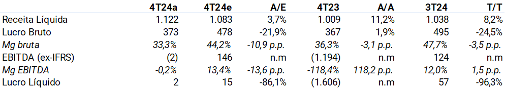 É interessante notar que: i) A cia. observou que a composição do estoque está em níveis saudáveis tanto em termos de categoria quanto de aging, com ajustes futuros de baixas potencialmente ocorrendo, embora em níveis mais normalizados e alinhados com o negócio; ii) O On-time in full (OTIF) permaneceu em ~70%, embora internacional ainda esteja em 55% (aumentando vs. 16% em 2023); iii) A empresa expandiu sua posição de caixa líquido para -0,3x dívida líquida/EBITDA; iv) O sellout ficou estável A/A no Brasil, após uma queda de 3% no 3T; e v) A cia. continua focada em encontrar um modelo equilibrado para as operações dos EUA, uma vez que a margem permanece em terreno negativo.