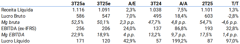 A Alpargatas apresentou resultados sólidos no 3º trimestre, com um EBITDA 24% acima da nossa estimativa, impulsionado por melhores dinâmicas de receita e custos. Embora já esperássemos uma melhora nas margens, a ALPA nos surpreendeu tanto no Brasil quanto no exterior, o que explica o forte desempenho do EBITDA no resultado. Em nossa visão, os sinais são positivos em todas as frentes, com o Brasil ganhando participação de mercado e expandindo margens, volumes se recuperando na Europa e os EUA se preparando para implementar seu novo modelo operacional em 2026. Além disso, a empresa anunciou que não exercerá a opção de compra da participação remanescente da Rothy’s, o que era amplamente esperado. Acreditamos que a melhora nos resultados da Rothy’s pode até abrir uma possibilidade futura de desbloqueio de valor por meio de seu desinvestimento.