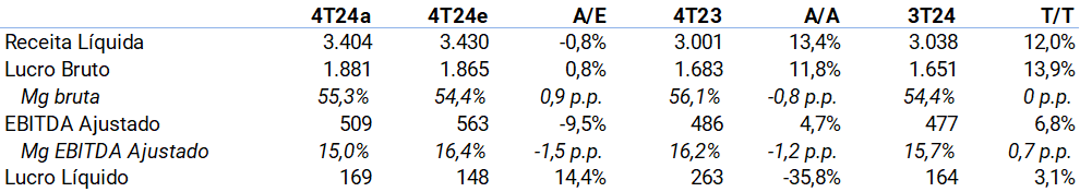 Analisando cada unidade de negócios: i) Vestuário Feminino foi principalmente apoiadao pela Farm Global (+39%) e Farm Brasil (crescimento de dois dígitos), além de um desempenho sólido em todos os canais principais; ii) Vestuário Democrático continuara sendo impulsionado pelo sell-out (+25%), embora notamos que o sell-in melhorou (+12% A/A contra +4% no 3T), principalmente em multimarcas (+15% contra +1% no 3T); iii) Vestuário Masculino teve um forte desempenho nas lojas próprias (+26%), enquanto o sell-in também foi um destaque, com todas as marcas apresentando crescimento de dois dígitos; e iv) As vendas de Calçados e Acessórios melhoraram em relação ao 3T (estáveis contra -3%), com franquias apresentando crescimento de 7% (contra -3% no 3T), embora o desempenho de multimarcas tenha piorado (-8%) pelo cenário macroe mais fraco.