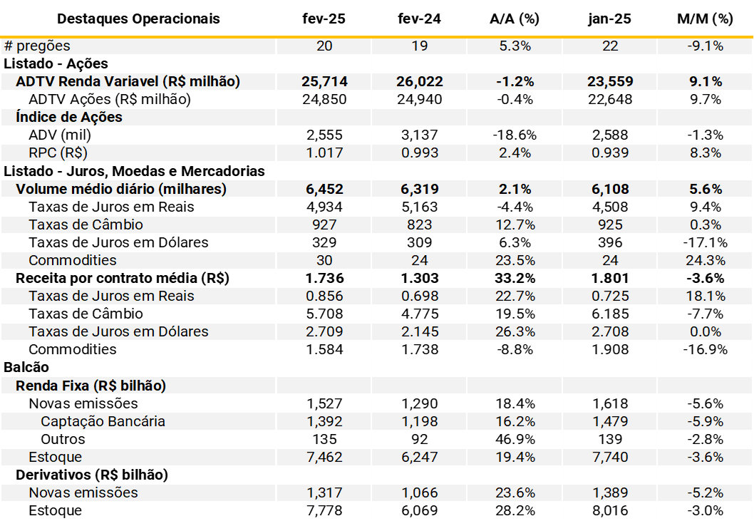 B3 (B3SA3): Pequena melhora sequencial impulsionada por derivativos | Destaques Operacionais da B3 para fevereiro de 2025