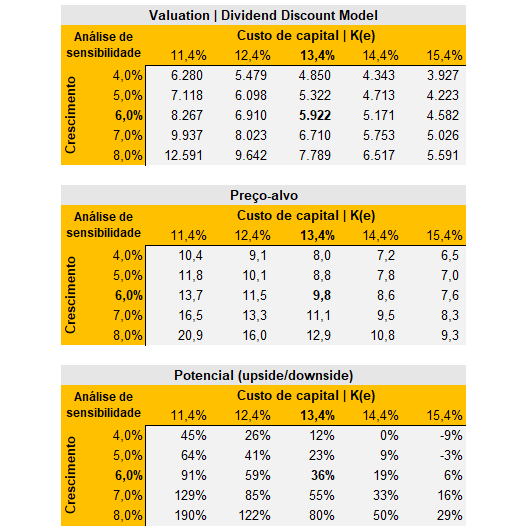 Como continuamos a ver o BMG como tendo riscos regulatórios e de execução maiores do que outros bancos sob nossa cobertura, utilizamos um beta de 1.5 para descontar os dividendos do banco, o que acarretou em um custo de capital próprio de 13.4% para o banco. Utilizamos uma taxa de crescimento de 6% na perpetuidade.