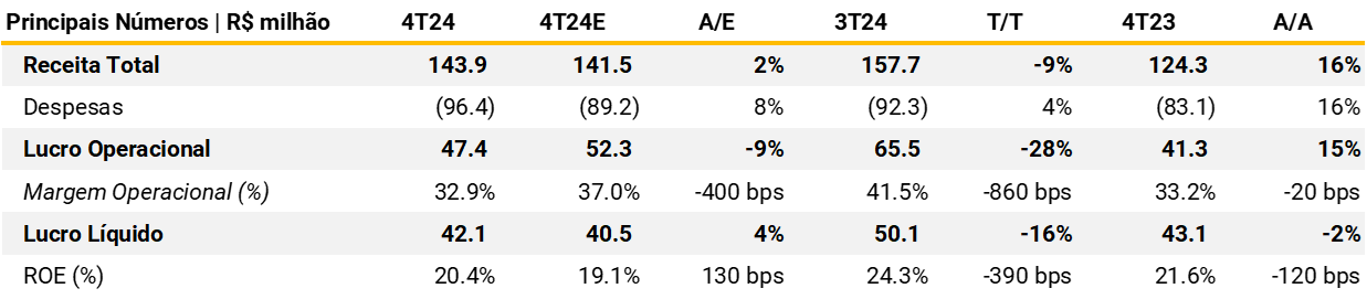 De forma inesperada, a BR Partners divulgou seus resultados do quarto trimestre antes da abertura do mercado. A BRBI apresentou resultados modestos no trimestre, embora em linha com nossas estimativas. No 4T, o agravamento das condições macroeconômicas impactou negativamente a receita. Ao mesmo tempo, a empresa adotou uma postura preventiva, resultando em uma provisão não recorrente no trimestre devido ao ambiente desafiador. Como consequência, o lucro líquido caiu para R$ 42,2 milhões (-15,8% T/T). Destacamos também que a empresa acelerou sua estratégia de warehousing de instrumentos financeiros, o que impactou o índice BIS, que encerrou o ano em 18,0% (-7,2 p.p. T/T). No geral, essa dinâmica trimestral levantou preocupações sobre o impacto nos resultados da BRBI caso o ambiente macroeconômico continue desafiador por um período prolongado. No entanto, mantemos nossa visão positiva sobre a empresa e sua capacidade de navegar cenários adversos.