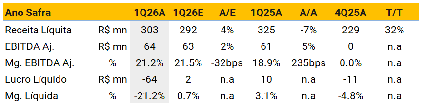 Os resultados do 1T geralmente perdem relevância, já que os números da safra antiga já estão majoritariamente precificados pelo mercado. Naturalmente, o foco passa a ser avaliar as perspectivas para a nova safra, especialmente em relação a: (i) progresso do plantio; (ii) evolução das proteções (hedge) e formação esperada de preços; e (iii) avanço na aquisição de insumos, com todos esses indicadores apontando para uma safra melhor A/A.