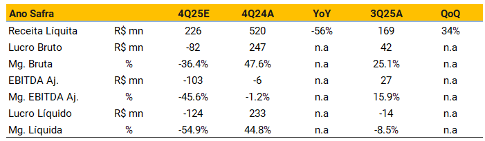 Estamos projetando que a BrasilAgro apresentará resultados fracos em seu último trimestre. Esperamos desempenho fraco na área de grãos, reflexo de adversidades operacionais no Mato Grosso. Além disso, a Companhia deve enfrentar desafios de produtividade na operação de cana-de-açúcar, impactada por adversidades climáticas que afetaram negativamente o setor durante o trimestre. No total, projetamos uma receita líquida consolidada da atividade agrícola de BRL 226 mn (-56% A/A) e um EBITDA ajustado negativo, em torno de BRL -103 mn. Embora esperemos resultados trimestrais fracos, acreditamos que os investidores devem focar na projeção da Companhia para a safra 2025/26, para a qual esperamos melhoria nas margens. Mantemos nossa recomendação Neutra para o papel.