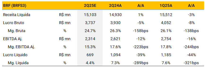 Esperamos que a receita líquida alcance BRL 7,8bn (+6% ToT e +14% AoA), principalmente apoiada pelo bom desempenho nas vendas processadas e pelo redirecionamento das exportações in natura para o mercado doméstico. Projetamos que os preços se beneficiem do repasse de preços do 1T, mas o in natura teve leve queda nos preços, levando a preços médios estáveis de BRL 12,8/kg (-0,1% ToT e +8% AoA). Contudo, devido ao aumento das despesas de SG&A, o EBITDA ajustado pode cair para BRL 1,2bn (-1% ToT e +18% AoA), resultando em margem EBITDA ajustada de 16,1% (-104bp ToT e -45bp AoA).