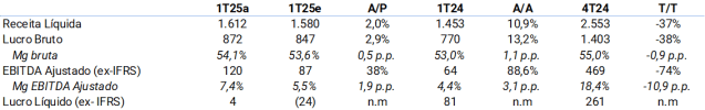 A rentabilidade também foi um destaque, com a margem bruta consolidada aumentando 1,1p.p em relação ao ano anterior, com vestuário aumentando 0,6p.p em relação ao ano anterior, devido a preços dinâmicos e coleções assertivas, enquanto um mix melhor sustentou a forte expansão da margem bruta da Fashiontronics (+9,2p.p). Enquanto isso, a margem EBITDA ajustada (ex-IFRS) aumentou 3,3p.p em relação ao ano anterior, uma vez que os maiores investimentos estratégicos em marketing foram mais do que compensados pela alavancagem operacional das despesas de ocupação e de pessoal, enquanto o C&A Pay teve provisões mais baixas devido às maiores taxas de cobrança e à redução das despesas operacionais (-17,5% em relação ao ano anterior). Finalmente, o lucro líquido atingiu R$4 milhões (vs. XPe em -R$24 milhões), com melhores resultados operacionais, enquanto a geração de caixa atingiu R$81 milhões (vs. -R$96 milhões no 1T24), principalmente em contas a receber e fornecedores.