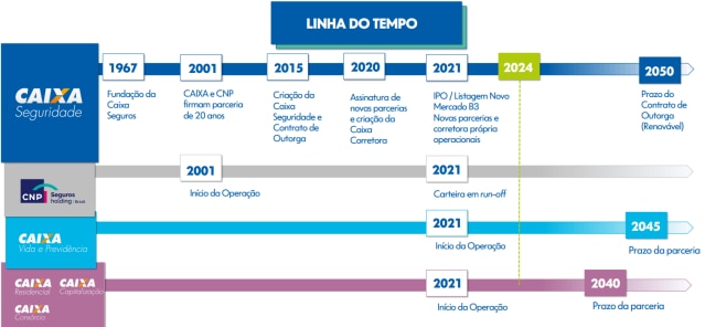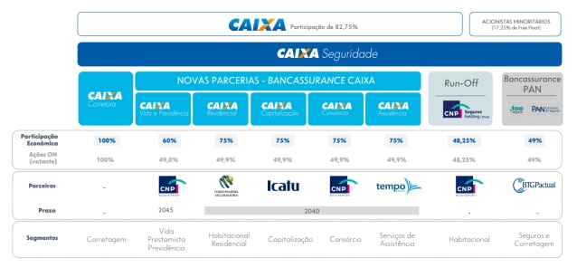 A Caixa Seguridade é uma holding que consolida várias joint ventures para oferecer seguros, previdência privada, planos de prêmios, consórcios, serviços de assistência e corretagem, seguindo um modelo semelhante ao de sua congênere BB Seguridade. A partir de 2021, após o fim da exclusividade da Caixa Seguros Holding, a Caixa Seguridade firmou novas parcerias com a CNP, Tokio Marine, Icatu e Tempo, que deverão ter validade de 20 a 25 anos. Espera-se que essas novas parcerias proporcionem à Caixa Seguridade um interesse econômico mais favorável em cada uma de suas subsidiárias e contribuam para uma maior lucratividade. Além disso, a Caixa Seguridade estabeleceu sua própria corretora, a Caixa Corretora. Uma operação de run-off de contratos de seguro de longo prazo, como hipoteca, continuará a gerar prêmios previamente contratados por meio da antiga parceria com a CNP (CSH) e, portanto, uma participação total de 75% nos resultados de subscrição de hipoteca só deverá ser alcançada em cerca de 10 anos.