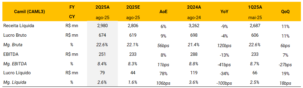 A Camil entregou resultados acima do esperado, com o desempenho superior sendo impulsionado principalmente por resultados mais fortes do que o previsto no Brasil. Os lucros se recuperaram T/T, embora ainda estejam abaixo A/A, refletindo a queda nos preços do arroz e comparações difíceis de volume devido a efeitos pontuais. Sequencialmente, (i) melhores volumes no segmento High Turnover; (ii) preços mais altos no segmento High Value; e (iii) volumes mais fortes no Uruguai compensaram a queda nos preços do arroz. A receita líquida foi de BRL 2,9bi (+6% vs. XPe e +11% T/T) e o EBITDA ajustado foi de BRL 251mi (+8% vs. XPe e +7% T/T), enquanto o lucro líquido foi 78% acima das nossas estimativas, totalizando BRL 79mi, devido a um efeito positivo¹ nos impostos. Devido a uma necessidade de capital de giro menor do que o esperado, o consumo de caixa foi de BRL 150mi, abaixo do esperado (~BRL 600mi), o que levou a alavancagem para ND/EBITDA de 4,1x (contra o covenant de 3,5x para o final do ano). Embora os lucros e o fluxo de caixa livre tenham superado as expectativas, não esperamos que os resultados do 2T25 representem um catalisador forte para a ação.