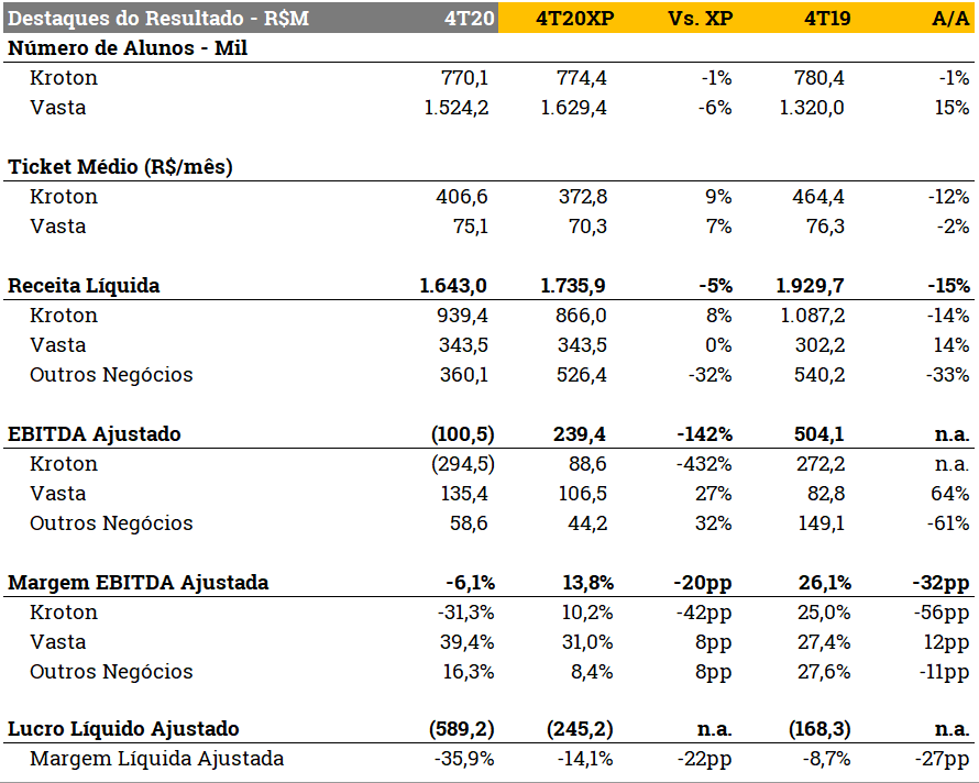 O EBITDA ajustado atingiu R$100M negativo, vs R$504M no 4T19 e nossa estimativa de R$239M, devido a maiores despesas com PDD na Kroton. O EBITDA Ajustado de 2020 atingiu R$690M, 71% menor A/A e 31% abaixo do guidance da empresa de R$1,0B.