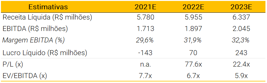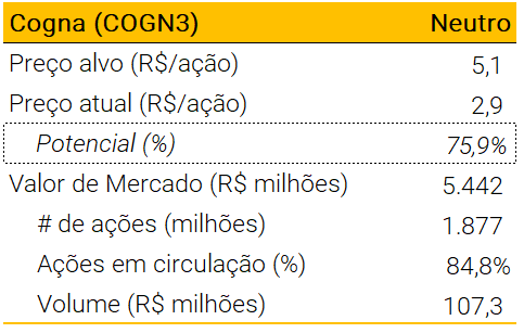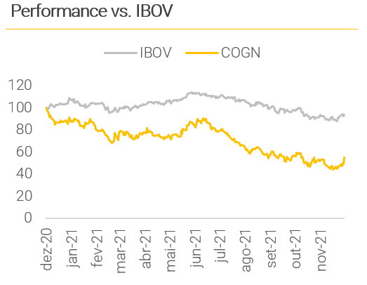 A Cogna sediou sua reunião anual de investidores (Cogna Day) e os destaques foram: (i) a separação de seu negócio de faculdades de medicina, atualmente com 636 vagas e potencial a ser avaliado em até R$1,9 bilhão; (ii) o fim da reestruturação da Kroton, que deve melhorar a margem EBITDA em 9 p.p. ainda em 2021; (iii) o potencial da Vasta de aumentar as receitas em mais de 32% A/A em 2022 e de continuar buscando oportunidades de crescimento no longo prazo; e (iv) o restabelecimento do guidance de EBITDA para 2024 em R$2,4B. No geral, saímos do evento com uma visão um pouco mais positiva do que tínhamos anteriormente em relação à empresa, mas não vemos sinais suficientes para mudar nossa visão cautelosa em relação ao papel.