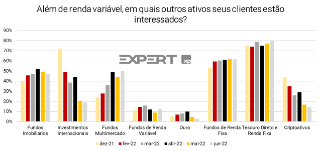 Além de Renda Variável, as classes de ativos que os assessores e seus clientes se mostraram mais interessados foram: 1) Tesouro Direto e Renda Fixa (80%, +3p.p. M/M); 2) Fundos de Renda Fixa (61%, -1p.p. M/M); 3) Fundos Multimercado (50%, +6p.p. M/M); 4) Fundos Imobiliários (47%, -2p.p. M/M); 5) Investimentos Internacionais (19%, –2p.p. M/M); 6) Criptoativos (15%, -2p.p M/M); 7) Fundos de Renda Variável (12%, +3p.p. M/M); e 8) Ouro (3%, -2p.p. M/M).