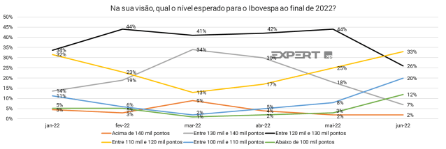 Segundo a pesquisa desse mês, 33% dos assessores acreditam que o Ibovespa ficará entre os 110.000 e 120.000 pontos até o final de 2022, um aumento de +8p.p. com relação a última pesquisa realizada em maio. Em seguida, 26% acreditam que o índice deve fechar o ano entre 120.000 e 130.000 pontos, uma queda de -18p.p M/M. Outros 20% acreditam que o índice ficará entre 100.000 e 110.000, +13p.p M/M, 12% acredita que ficará abaixo dos 100.000, +9p.p M/M, e 7% acredita que terminará o ano entre 130.000 e 140.000 pontos (-11p.p M/M). Por fim, os 2% restantes acreditam que o Ibovespa terminará 2022 acima dos 140.000 pontos.