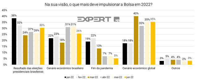 Em relação aos propulsores da Bolsa, na visão dos assessores, os maiores são: 1) cenário econômico global (35%, +0p.p. M/M); 2) resultado das eleições presidenciais (30%, +4p.p. M/M); 3) cenário econômico brasileiro (26%, -5p.p. M/M) ; 4) fim da pandemia (5%, -2p.p. M/M) e 5) outros (3%, +1p.p. M/M). Esses resultados mostram que os assessores estão atentos ao cenário internacional em relação ao que pode interferir no desempenho da Bolsa em 2022, mas também estão começando a olhar mais para o cenário interno, à medida que as eleições se aproximam.