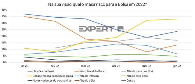 Desaceleração econômica global continua a ser o maior risco para investidores. Em relação aos riscos, o destaque continuou a ser a desaceleração econômica, chegando a 33%, um aumento de +1p.p M/M. Eleições presidenciais foi visto como o segundo maior risco em 24% (+5p.p. M/M), seguida da alta de juros nos Estados Unidos em 17% (+2p.p. M/M).