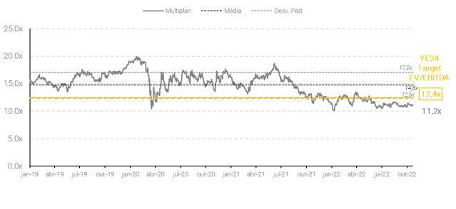 Estamos divulgando nossa prévia dos resultados da Multiplan no 3T22. Além disso, aproveitamos para atualizar nossas estimativas, e estamos aumentando nosso preço-alvo de R$ 28,00 para R$ 33,00 principalmente devido a resultados acima do esperado em relação às nossas estimativas. Continuamos a ver uma via de crescimento interessante a partir de: (i) crescimento orgânico; (ii) expansões; (iii) M&A; (iv) Golden Lake. Assim, reiteramos a Multiplan como nossa principal escolha no segmento de shoppings.
