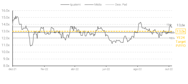 Estamos revisando nossas estimativas e atualizando nosso preço-alvo 2023 para a Iguatemi para incorporar os resultados mais recentes e o follow-on. Incorporamos mudanças em nossas perspectivas de receita líquida, tendo em vista os resultados operacionais mais fortes do que o esperado da Iguatemi, acelerando o crescimento da receita. Por outro lado, nossas perspectivas de lucro líquido desaceleraram significativamente em 2022, devido aos efeitos da Infracommerce. Além disso, esperamos um efeito mais significativo dos resultados financeiros em 2023, mantendo nossas estimativas de FFO estáveis em relação às estimativas anteriores. Assim, mantemos nosso TP 2023 em R$ 28,00/unit. para IGTI11.