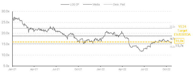 Além disso, vemos a LOGG3 negociando 17,2x EV/EBITDA em 2023, o que parece exigente apesar do portfólio premium e execução sólida, mas vemos uma via de crescimento interessante vindo do plano “Todos por 1,5”.