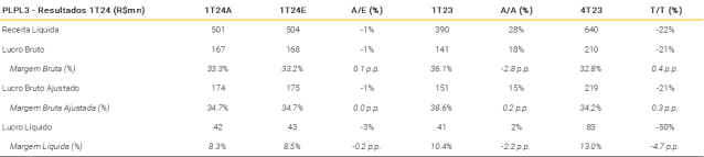 A Plano&Plano registrou resultados mistos e em linha, principalmente devido à compressão da receita T/T e aos níveis de margem líquida pressionados de 8,3% (-2,2 p.p. A/A). No entanto, continuamos a ver uma sólida avenida de crescimento para a empresa em termos de lançamentos em 2024, mantendo nossa compra com base em um valuation atrativo, negociada a 4,8x P/E 25E.