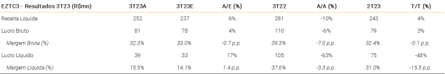 A EZTEC registrou resultados mistos, explicados pela queda da receita líquida para R$252 milhões (-10% A/A), ligeiramente acima de nossas estimativas (6% vs. XPe) devido ao fraco desempenho das vendas líquidas (consulte “Lançamentos fracos afetando as vendas líquidas” para nossa visão detalhada sobre o desempenho operacional da EZTEC no 3T23).
