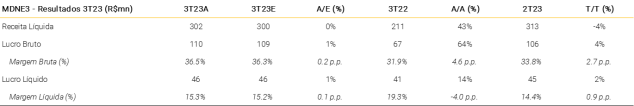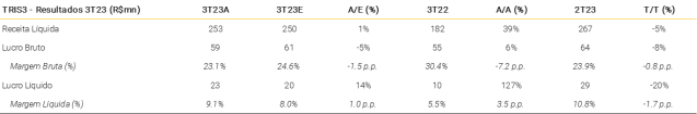 A receita líquida teve um desempenho robusto no 3T23, atingindo R$557 milhões (+39% A/A e +15% T/T), ligeiramente acima de nossas estimativas (+3% vs. XPe). Acreditamos que esse desempenho foi impulsionado por (i) vendas líquidas recordes (+52% A/A) no trimestre (veja nosso comentário de prévia operacional); e (ii) fortes vendas de estoque, que podem ter impulsionado o reconhecimento de receita.