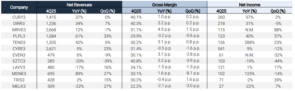 Após um trimestre marcado por tendências divergentes de receita entre as empresas, o desempenho do segmento deve continuar a depender em grande parte da conversão da carteira de pedidos e do prazo de entrega, com os lançamentos influenciando o reconhecimento de forma diferente, dependendo do estágio do projeto. MDNE e Cyrela devem se destacar nesta temporada. Esperamos que a Cyrela registre um sólido crescimento de +9% no lucro líquido em relação ao ano anterior, impulsionado por (i) margens brutas estáveis em 31,4% e (ii) reconhecimento constante de receita de projetos em andamento. A MDNE deve apresentar a expansão mais forte do segmento, impulsionada por um aumento acentuado no reconhecimento de taxas de retorno (+659% em relação ao ano anterior), contribuindo para um desempenho mais forte do segmento de condomínios, mais do que compensando os padrões mistos de margem entre os pares.