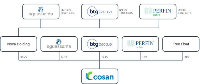 Após a transação, a Aguassanta deterá 50,01% das ações vinculadas ao acordo (21,3% do capital total, dos quais 14,6% vinculados), o BTG 29,8% (23,3% do capital total, dos quais 8,7% vinculados) e a Perfin 20,2% (10,4% do total, dos quais 5,9% vinculados). O free float representará os 45% restantes do capital da Cosan. Nos termos do acordo, a Aguassanta nomeará cinco membros do conselho, incluindo um independente, enquanto o BTG e a Perfin nomearão conjuntamente quatro, incluindo também um independente.