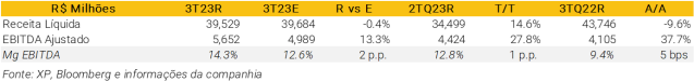 Nossa opinião: A Cosan reportou fortes resultados no 3T23, com melhor EBITDA Ajustado em todos os níveis (superando nossas estimativas em 13%): a Compass se beneficiou de um melhor mix (apesar de um ambiente desafiador para os volumes de distribuição de gás natural) e dos primeiros volumes comercializados de GNL; Rumo pela contínua dinâmica positiva de yield e aumento de volume; Raízen pela sólida recuperação nos resultados de Mobilidade e dinâmica positiva de Renováveis em vigor, e; Moove pela margem mais alta de todos os tempos. O maior EBITDA também ajudou a reduzir a alavancagem (uma grande preocupação para os investidores, não há muito tempo), apesar da eliminação gradual dos derivados de colarinho da aquisição da Vale. Do lado negativo, as despesas corporativas continuam aumentando. Mesmo assim, vemos o resultado do 3T23 com um saldo líquido bastante positivo e, apesar de todas as entregas, a empresa continua com um grande desconto de holding. Mantemos nossa recomendação de compra.