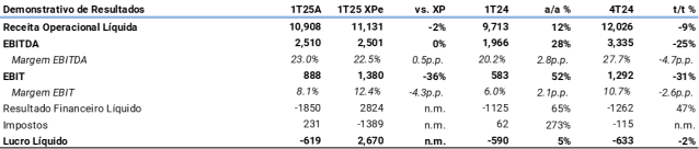 A CSN reportou resultados em linha com o esperado no 1T25, com EBITDA ajustado de R$2,509 milhões, -25% T/T e +28% A/A (em linha com a expectativa da XPe). Observamos: (i) um desempenho sequencial mais fraco na divisão de Aço, com margens caindo para 7,9% no 1T25 (-3 p.p. T/T), refletindo volumes de vendas sazonalmente mais baixos e custos ligeiramente mais altos, com custos de placas estáveis T/T, o que pode implicar um impacto neutro nos custos para o 2T25E; (ii) resultados neutros das operações de Mineração (clique aqui para mais detalhes sobre os resultados da CSN Mineração no 1T25); (iii) números pressionados na divisão de Cimento, devido a volumes sazonalmente mais fracos e um ambiente competitivo mais acirrado; e (iv) um desempenho razoável das divisões de Energia e Logística. Por fim, a alavancagem caiu ligeiramente para ~3,3x ND/EBITDA (vs. ~3,5x no 4T24), embora continue sendo uma das principais preocupações dos investidores em relação à tese de investimento da CSN. Reiteramos nossa classificação Neutra para as açõeDestaques financeiros: EBITDA ajustado de R$2,509 milhões, -25% T/T, +28% A/A (em linha com a expectativa da XPe). A dívida líquida alcançou R$35,8 bilhões, com uma relação dívida líquida/EBITDA de ~3,3x (vs. ~3,5x no 4T24). O capex foi de R$1,1 bilhão no 1T25, refletindo a construção da infraestrutura do P15 e investimentos relacionados à parada de manutenção do AF#2 na UPV. O fluxo de caixa livre foi negativo em R$173 milhões, devido ao aumento do capex e dos resultados financeiros.