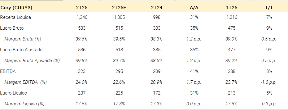 A Cury divulgou resultados fortes no 2T25, atendendo às altas expectativas para o 1S25.