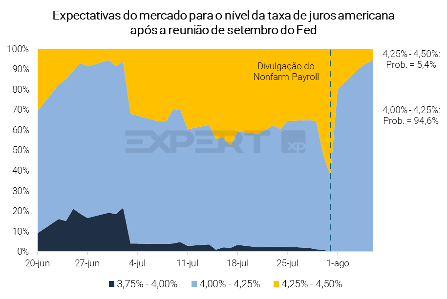 Desde a semana passada, as expectativas do mercado para a próxima reunião de decisão de juros do Federal Reserve (Fed) em setembro passaram por uma mudança relevante, após a divulgação de dados mais fracos do mercado de trabalho dos EUA, que apontaram para uma desaceleração da atividade econômica.