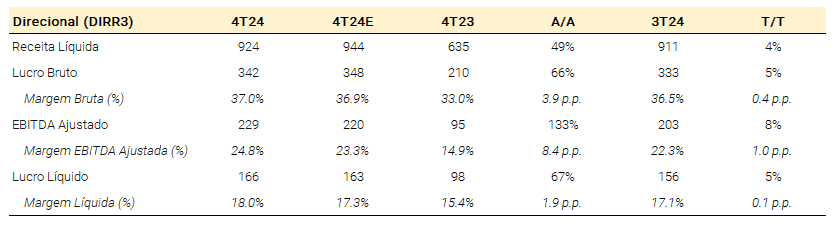 A Direcional reportou fortes resultados no 4T24. Os principais destaques incluem: (i) sólido crescimento da receita líquida de 46% A/A, suportado por um significativo crescimento de vendas líquidas; (ii) a receita de backlog aumentou 10% T/T, reforçando as expectativas positivas para o crescimento da receita em 2025; (iii) a margem bruta aumentou para 37,0% (+0,5 p.p. T/T e +0,2 p.p. em relação às nossas estimativas); (iv) a margem de backlog expandiu para 43. 9% (+50 bps T/T), indicando uma forte rentabilidade à frente; (v) o lucro líquido ajustado atingiu R$166 milhões (+69% YoY e +2% vs. XPe), resultando num notável aumento do ROE para 33%; e (vi) o indicador Dívida líquida/PL diminuiu para -3,1%, suportado por uma sólida geração de caixa, que acreditamos que permitirá o pagamento de dividendos substanciais em 2025.