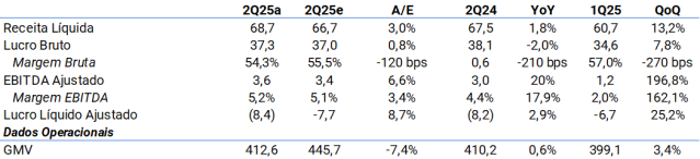 A margem bruta caiu 1,2 p.p ano a ano (-2,7 p.p trimestre a trimestre), principalmente devido ao mix de vendas, enquanto a Elo7 também enfrentou custos de frete mais altos. Enquanto isso, o EBITDA ajustado (excluindo plano de opções de ações não monetárias e despesas pontuais de M&A) foi positivo novamente, em R$ 3,6 milhões, resultado de menores investimentos em marketing (-25%) e otimização de G&A após as recentes demissões em maio de 2025. No entanto, a contribuição da Cresci e Perdi caiu fortemente trimestre a trimestre, para R$ 0,2 milhão (contra R$ 2,2 milhões no 1T), com vendas caindo 6% trimestre a trimestre e EBITDA caindo 2,6%, enquanto o prejuízo líquido foi de -R$ 8 milhões. Por fim, o fluxo de caixa livre foi positivo em R$ 1 milhão (excluindo investimentos em M&A), principalmente devido a melhores condições com fornecedores e menores investimentos em Capex.