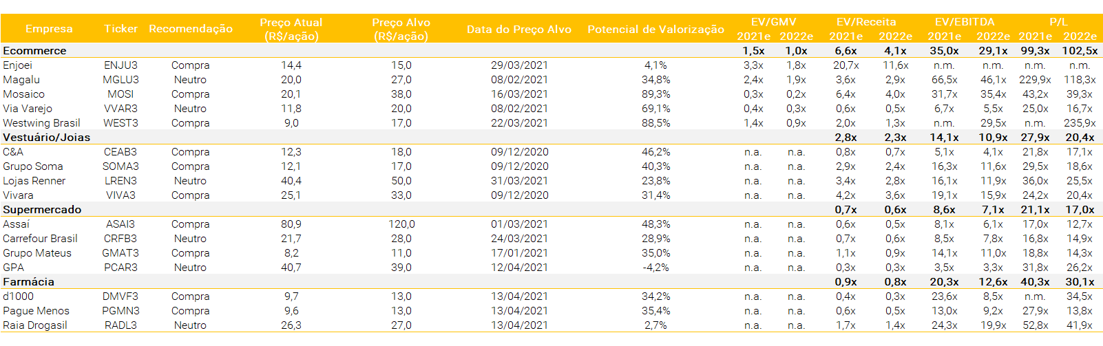 Quais tópicos abordamos ao longo do conteúdo? (i) Notícias no Brasil e no mundo que tem impactos diretos ou indiretos no setor; (ii) Nossa tabela de múltiplos, atualizada todas as sextas-feiras de cada semana; e (iii) Nossa lista de últimos relatórios publicados pela equipe de Varejo do Research da XP.
