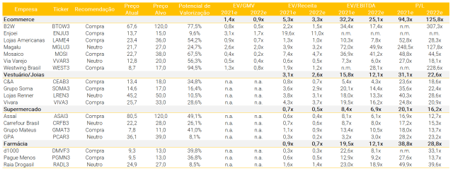 Quais tópicos abordamos ao longo do conteúdo? (i) Notícias no Brasil e no mundo que tem impactos diretos ou indiretos no setor; (ii) Nossa tabela de múltiplos, atualizada todas as sextas-feiras de cada semana; e (iii) Nossa lista de últimos relatórios publicados pela equipe de Varejo do Research da XP.