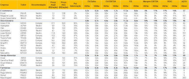 Quais tópicos abordamos ao longo do conteúdo? (i) Notícias no Brasil e no mundo que tem impactos diretos ou indiretos no setor; (ii) Nossa tabela de múltiplos, atualizada todas as sextas-feiras de cada semana; e (iii) Nossa lista de últimos relatórios publicados pela equipe de Varejo do Research da XP.