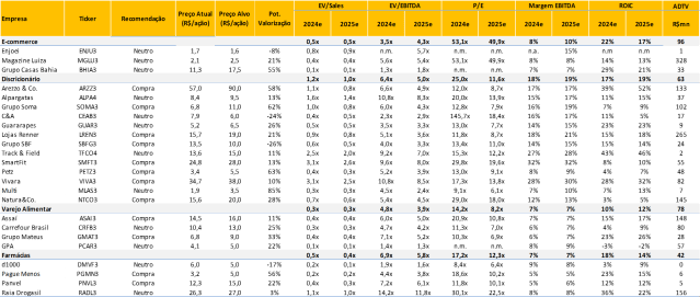 Quais tópicos abordamos ao longo do conteúdo? (i) Notícias no Brasil e no mundo que tem impactos diretos ou indiretos no setor; (ii) Nossa tabela de múltiplos, atualizada todas as sextas-feiras de cada semana; e (iii) Nossa lista de últimos relatórios publicados pela equipe de Varejo do Research da XP.