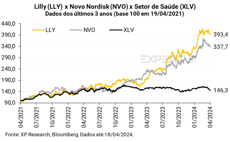 Outras farmacêuticas entraram na corrida e têm obtido variados graus de sucesso. O principal destaque é a americana Lilly, que desponta como a principal concorrente da pioneira Novo Nordisk desde que seu medicamento Mounjaro foi aprovado para uso. Desde o início de 2024, as farmacêuticas Novo Nordisk e Lilly apresentam alta de 18,7% e 28,0%, respectivamente, contra uma alta de apenas 1,5% do setor de saúde nos EUA (XLV).