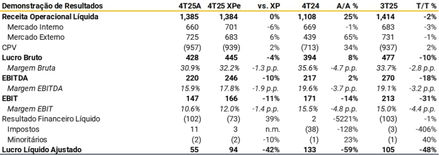 Rentabilidade. A margem EBITDA ajustada de 15,4% contraiu mais do que antecipávamos, recuando -4,0p.p. A/A (-2,4p.p. vs. XPe), encerrando no piso do guidance para 2025 (17,8% vs. intervalo de 17,5%-20,5%). Atribuímos esse desempenho principalmente a maiores custos de matérias-primas, decorrentes de um mix de produtos mais desfavorável e do crescimento de itens co-manufaturados, além de volumes sazonalmente mais baixos.