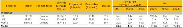 Para aves e suínos, em parte devido à recuperação das exportações, mas também devido a uma sazonalidade de consumo mais forte, projetamos um trimestre de melhora, porém, com a piora das safras de milho e soja no Sul do Brasil, devemos esperar outro movimento de pressão de preços e custos em 2022, corroendo as margens, uma vez que o repasse de preços deve ser desafiador devido à inflação persistente afetando os consumidores.