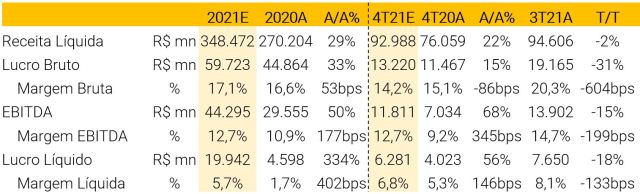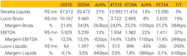 Apesar de uma queda sequencial na carne bovina dos EUA devido à sazonalidade, esperamos que a operação ainda surpreenda com margens bem acima dos níveis históricos, enquanto esperamos que a carne suína dos EUA continue se recuperando A/A. Além disso, esperamos que a PPC reporte um forte aumento A/A, tanto para as margens quanto para o faturamento. Portanto, prevemos que a receita líquida das operações dos EUA aumente 15% no comparativo anual (-10% T/T), enquanto esperamos que as margens bruta e EBITDA aumentem 365bps e 579bps A/A, respectivamente (-473bps e -233bps T/T). Para o Brasil, apesar dos impactos da proibição de importação de carne bovina da China, esperamos que a receita cresça 21% A/A. Apesar das melhores margens A/A e T/T para o Friboi, a Seara ainda está atrasada, em nossa visão, e por isso projetamos margens praticamente estáveis para as operações no Brasil. No total, projetamos bons resultados para o 4T21, com receita líquida consolidada crescendo 22% A/A enquanto a margem EBITDA deve aumentar 354 bps, levando o EBITDA a aumentar 68% no trimestre.