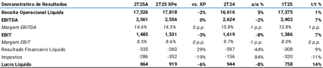A Gerdau divulgou resultados em linha com as nossas expectativas, com EBITDA ajustado de R$2,7 bilhões (+7% T/T), refletindo um desempenho sólido na América do Norte, parcialmente compensado por uma performance mais fraca no Brasil. Destacamos: (i) desempenho robusto na divisão da América do Norte, com maiores volumes de vendas (+2% T/T) e preços (+5% T/T em USD), além de uma carteira sólida (encerrando o trimestre com ~70 dias), indicando demanda firme à frente; (ii) desempenho mais fraco na divisão Brasil, refletindo menores preços domésticos e maior custo por tonelada (+7% T/T), principalmente devido à parada de manutenção na usina de Ouro Branco (ainda em ramp-up); (iii) fluxo de caixa livre (FCF) negativo de R$0,8 bilhão, devido a compromissos elevados de capex e aumento nos pagamentos de juros e impostos no trimestre. Por fim, a Gerdau anunciou dividendos de R$0,12/ação (dividend yield anualizado de 2,8%), com pagamento a partir de 12 de agosto. Reiteramos nossa recomendação de compra para Gerdau, com upside assimétrico em FCF e valuation (mais detalhes aqui).