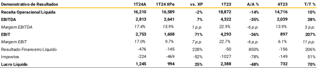 Nossa visão: Com os resultados do 1T24 apoiadas por resultados relativos mais fortes da América do Norte e as operações domésticas melhorando progressivamente a partir de um nível inferior no 4T23, esperamos que nossa faixa de EBITDA de ~ R$ 10-11 bilhões para 2024E se torne mais realista entre os investidores, implicando um assimétrico (e altamente descontado) nível de avaliação de 3,6x EV/EBITDA e reforçando nossa visão positiva sobre o nome.
