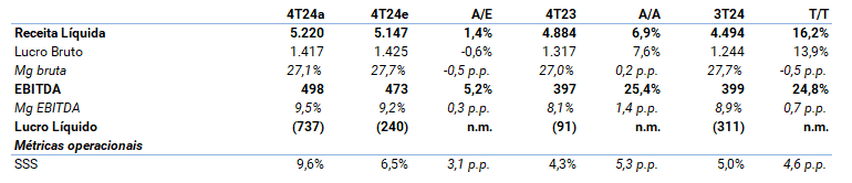 As vendas líquidas cresceram +7% A/A, suportadas pelo desempenho acelerado de vendas mesmas lojas em todos os formatos (vendas mesmas lojas consolidado em +9,6% vs. +5% no 3T24), principalmente impulsionado por volumes mais altos e ajustes operacionais, mais do que compensando a queda de vendas dos Aliados (B2B) (-24%). No entanto, observamos que o desempenho do formato de proximidade foi mais fraco em comparação aos outros, com apenas uma leve aceleração em relação ao trimestre anterior (+0,3p.p), apesar de bases de comparações mais fáceis (vendas mesmas lojas em zero no 4T23).