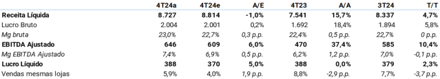 As vendas líquidas aumentaram 16%, apoiadas pela forte expansão(+15 novas lojas e +1 CD em 2024), embora com tendências de desaceleração das vendas mesmas lojas (+4% vs. +7,7% no 3T), impulsionadas principalmente pelo atacarejo, com +2,1%, -3,3pp vs. 3T e abaixo da ASAI (4,4%) e do Atacadão (6,8%). Esse desempenho inferior do SSS foi resultado de i) um dezembro mais fraco, com volumes menores sendo compensados por preços mais altos; e ii) a maturação das lojas da Nova Regional, com a empresa focando na rentabilidade a partir do segundo ano das lojas, o que leva a uma dinâmica esperada de vendas mesmas lojas pressionadas.